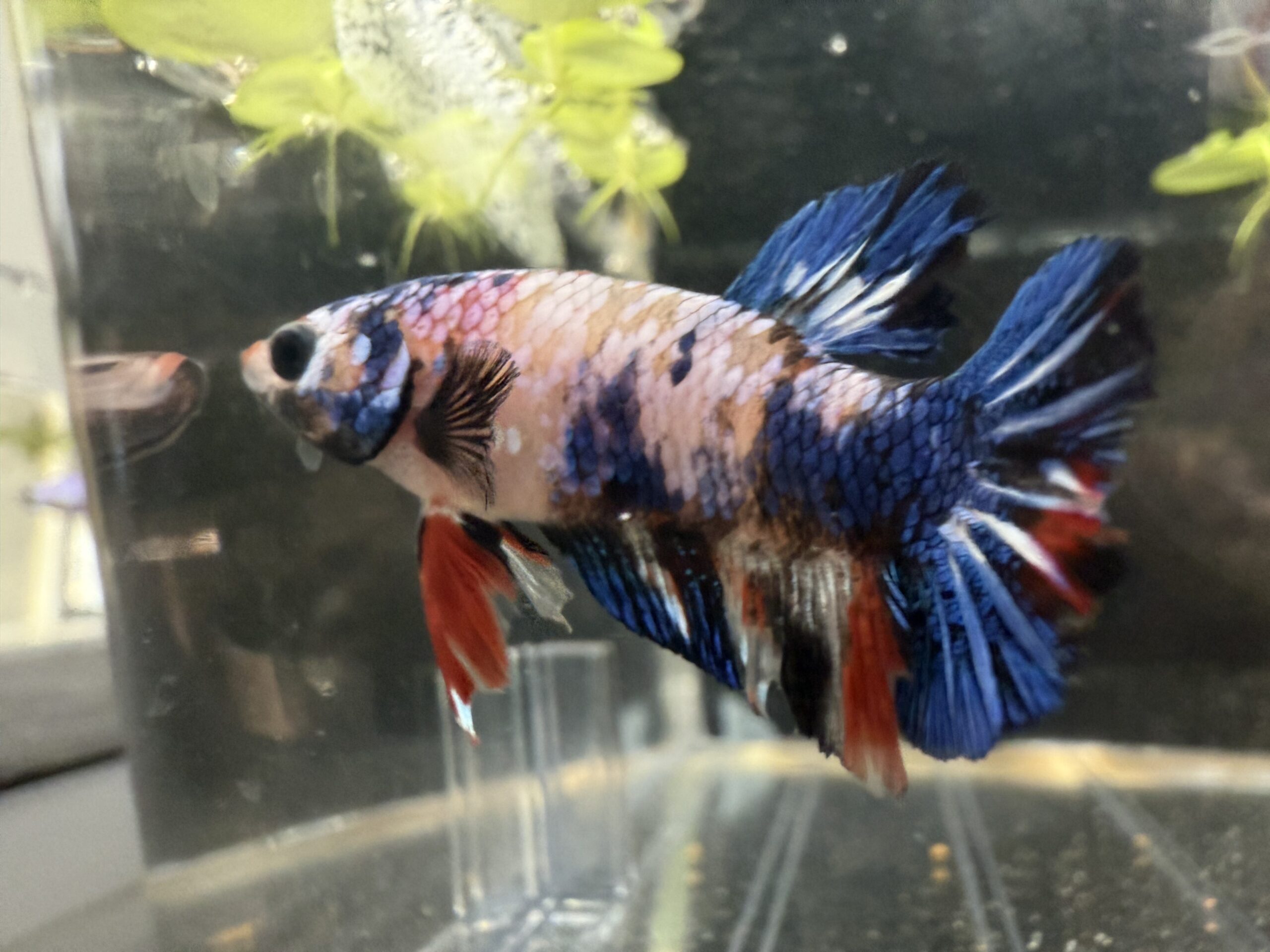 Stunning pond-raised male koi betta with vibrant multicolored patches resembling traditional Japanese koi.